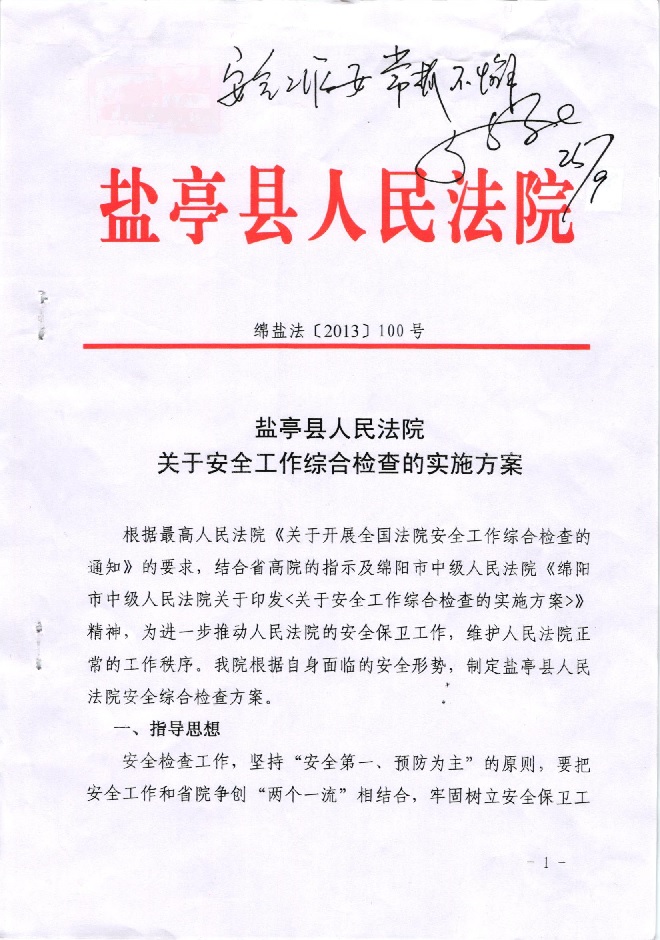 盐亭县委书记陈朝先对绵盐法(2013)100号文件做出批示